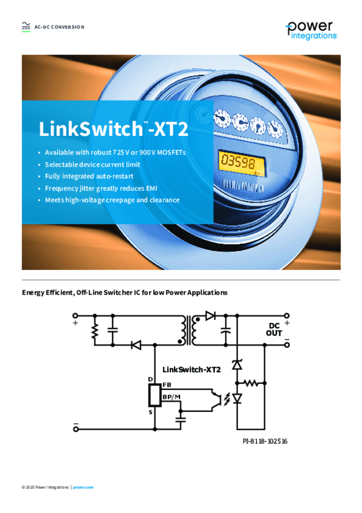 Integrated off-Line switcher with EcoSmart Technology, unleashing up to 175 W output and achieves 92% efficiency in classic flyback architecture