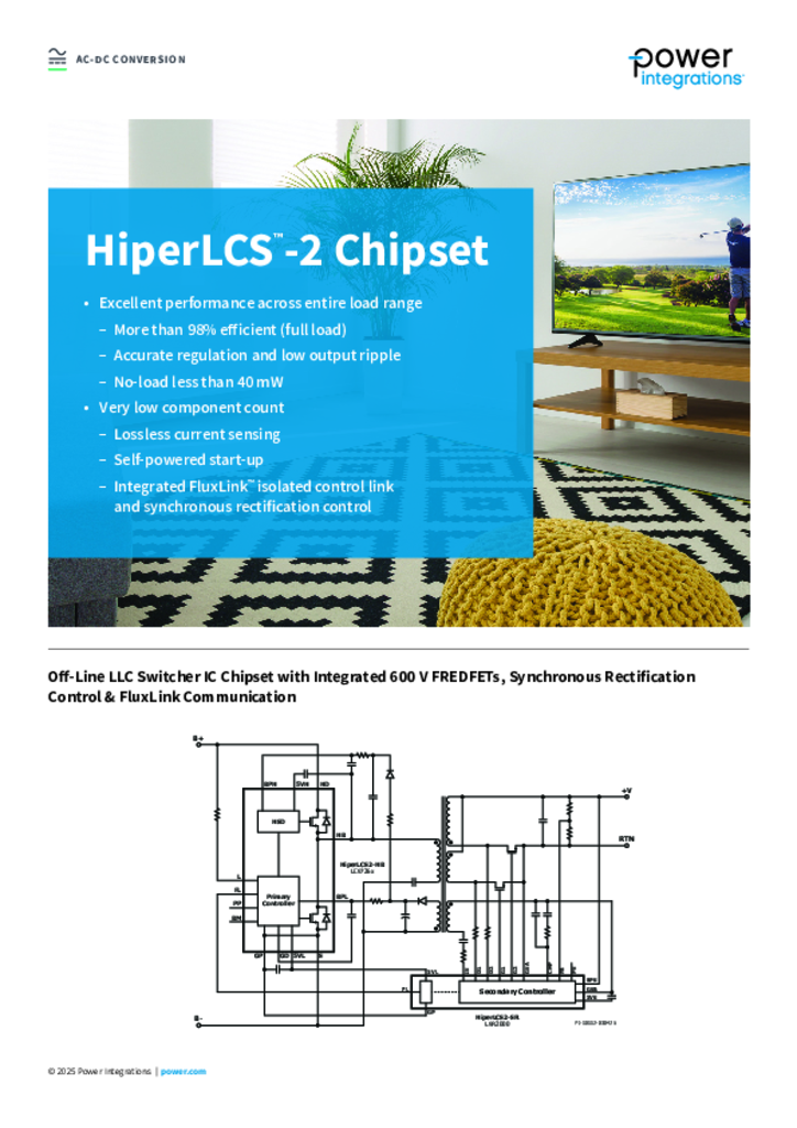 Off-Line LLC Switcher IC Chipset - HiperLCS2-HB Half-bridge Power Device with Integrated 600 V FREDFETs & HiperLCS2-SR Safety Isolation Device with Synchronous Rectification and FluxLink Feedback
