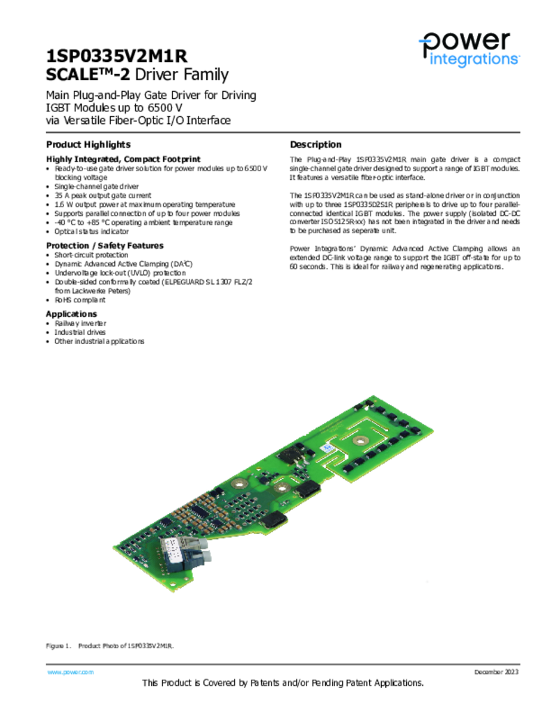 1SP0335V2M1R Data Sheet Single-Channel SCALE-2 Plug-and-Play Driver for IGBTs from 3300 V to 6500 V with external DC/DC Converter, Designed for Railway Applications 下載 PDF 檢視 PDF Login Required A MyPI account is required to receive email notifications for document updates. Please login or register for an account to continue. Continue × 文件更新請通知我 應用 產品 1SP0335 Railway