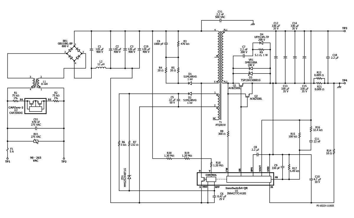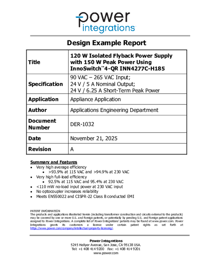DER-1032 - 120 W Isolated Flyback with 150 W Peak Power for Appliances Using InnoSwitch4-QR
