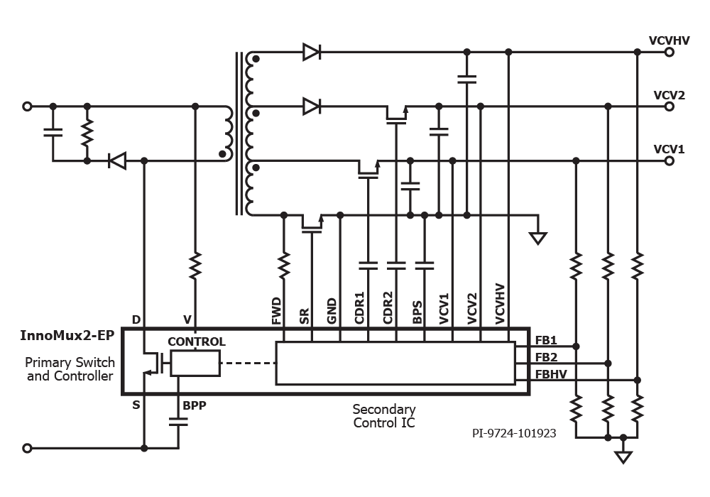 - RDR-1053 - 使用InnoMux2-EP(1700V PowiGaN开关)的60W双路输出反激式工业电源
