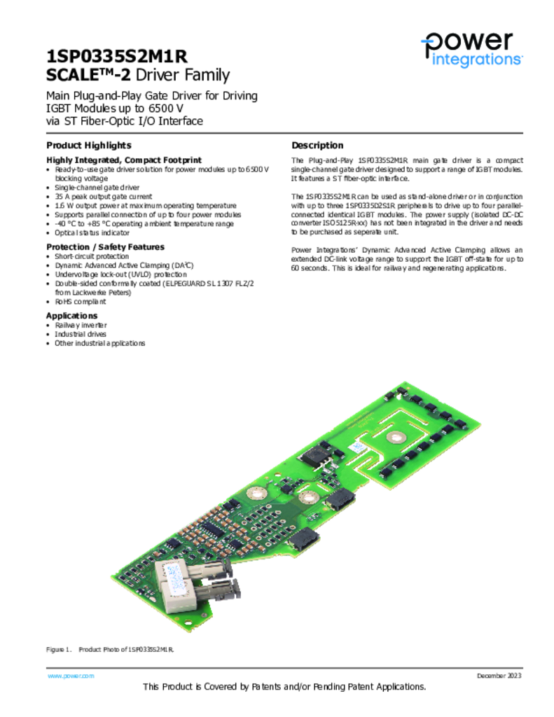 1SP0335S2M1R Data Sheet Single-Channel SCALE-2 Plug-and-Play Driver for IGBTs from 3300 V to 6500 V with external DC/DC Converter, Designed for Railway Applications 下载PDF 查看PDF Login Required A MyPI account is required to receive email notifications for document updates. Please login or register for an account to continue. Continue × 文件更新请通知我 应用 产品 1SP0335 Railway
