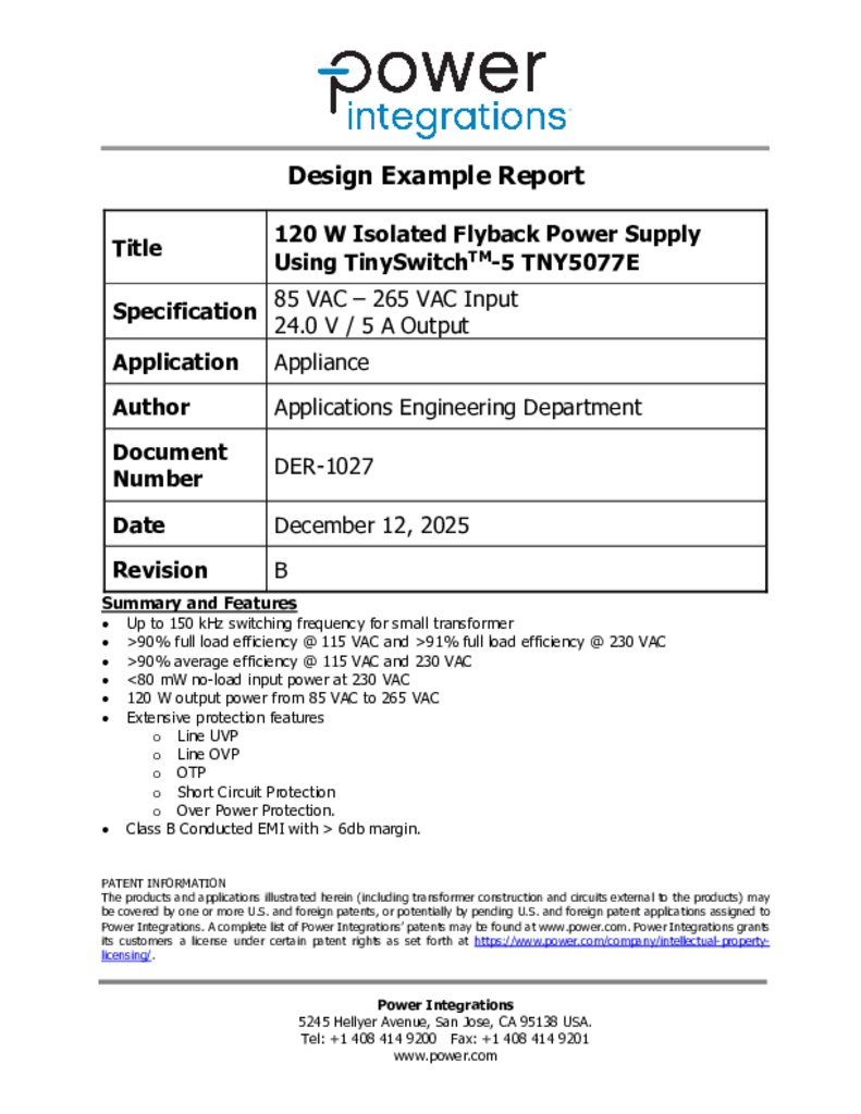DER-1027 - 适用于工业应用的120 W隔离反激式电源,采用TinySwitch-5 适用于工业应用的120 W隔离反激式电源,采用TinySwitch-5(TNY5077E) 输出:24 V,5 A 输入:85 - 265 VAC <150 kHz开关频率,适用于小型变压器 >90%满载效率(115 VAC) >91%满载效率(230 VAC) >90%平均效率(115 VAC 和 230 VAC) <80 mW空载输入功耗(230 VAC) 下载PDF 查看PDF Login Required A MyPI account is required to receive email notifications for document updates. Please login or register for an account to continue. Continue × 文件更新请通知我 应用 产品 TinySwitch-5