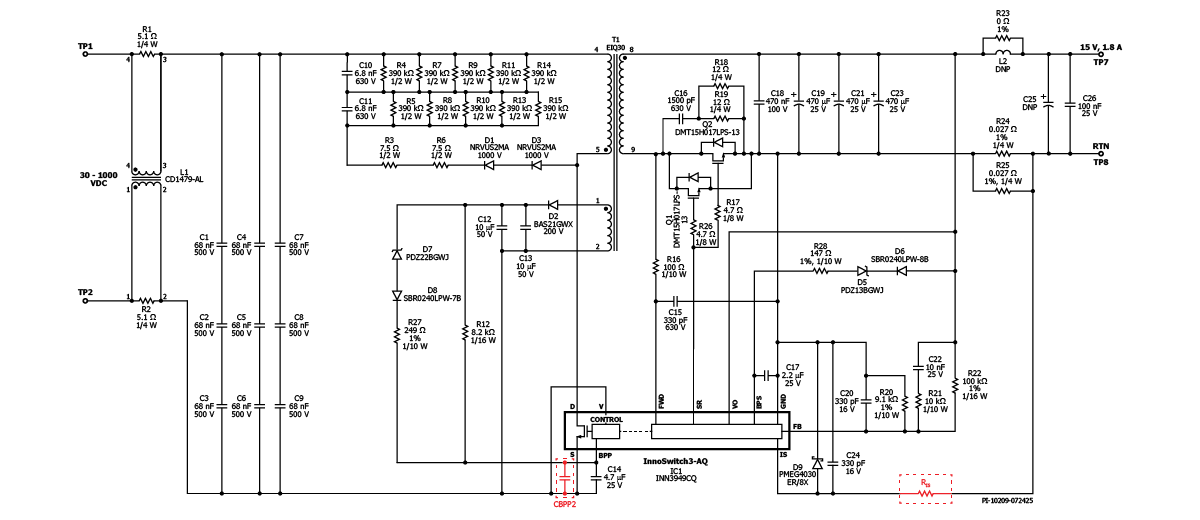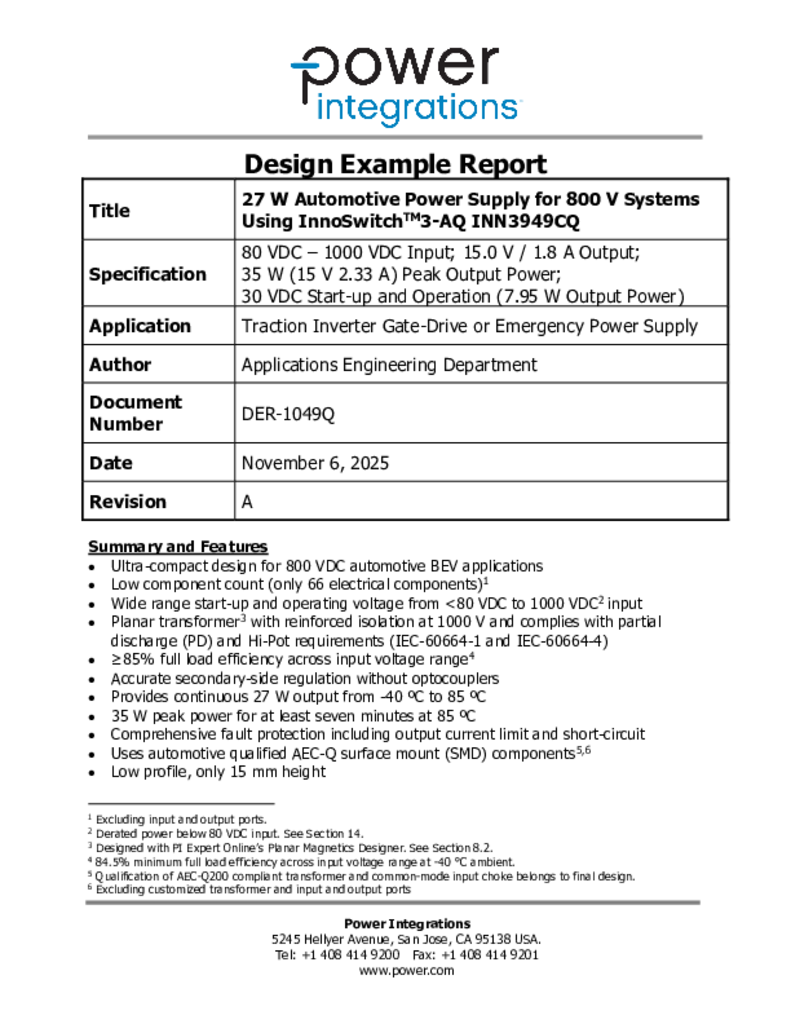 DER-1049Q - 27 W Power Supply with Planar Transformer for 800 V BEV Using InnoSwitch3-AQ (1700 V Sic Switch)