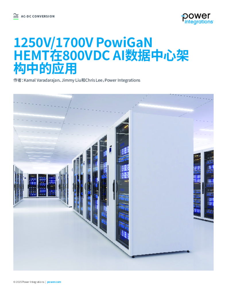 1250V/1700V PowiGaN HEMT在800VDC AI数据中心架构中的应用 人工智能计算的需求正在推动数据中心电源架构向更高效率和更高功率密度发展。Power Integrations 在这篇新的白皮书中解释了 1250 V 和 1700 V PowiGaN 氮化镓(GaN)技术在下一代电源架构中的应用能力。 该白皮书在 2025 年 OCP 全球峰会上发布,NVIDIA™ 在会上分享了向 800 VDC 数据中心电源过渡以支持兆瓦级机架的见解。 点击此处了解更多。 下载PDF 查看PDF Login Required A MyPI account is required to receive email notifications for document updates. Please login or register for an account to continue. Continue × 文件更新请通知我