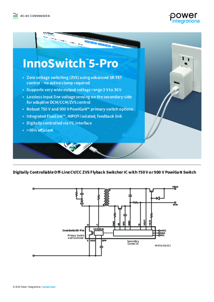 搭配整合式 750 V PowiGaN 切換開關的小型高效率 PFC 控制器